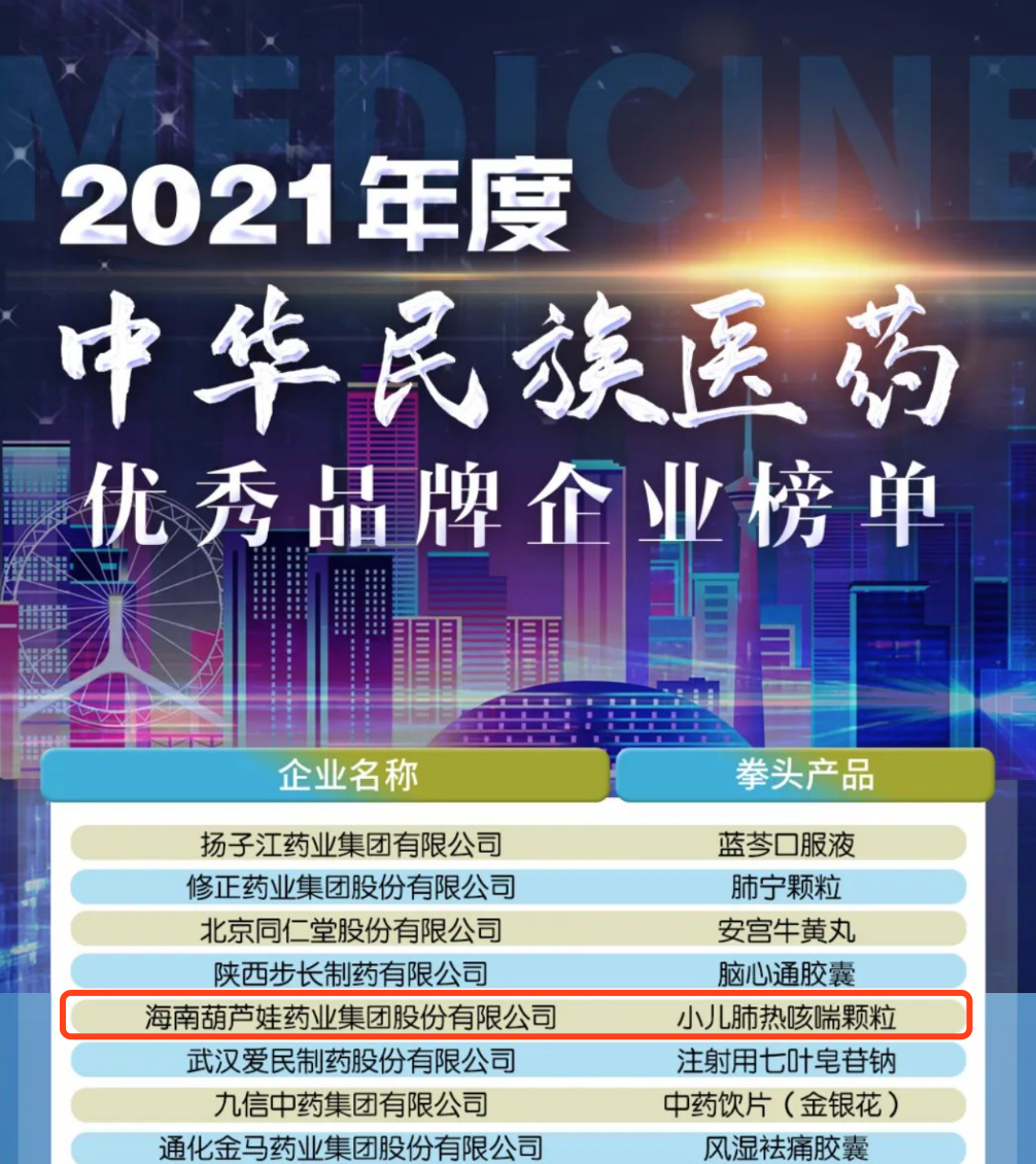 12月29日,全国工商联医药业商会发布了“2021年度中华民族医药优秀品牌企业榜单”,豪门国际药业集团凭借黄金单品小儿肺热咳喘颗粒(4克)实力登榜。